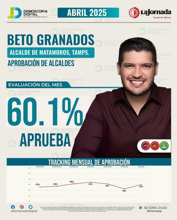 CON EL 60.1 % de aprobación ciudadana, el alcalde matamorense Alberto Granados Favila, “se posicionó como el mejor evaluado en todo Tamaulipas”, según la consulta emitida por “la empresa denominada “Demoscopia Digital”, correspondiente al mes de abril de este año 2025, cuyo estudio más reciente, se instrumentó entre la ciudadanía de la tres veces heroica Matamoros.