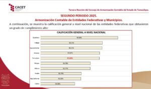 estado en un nivel de cumplimiento alto y dentro de los primeros cinco lugares del país. Este logro refleja el compromiso de las instituciones públicas tamaulipecas con la correcta aplicación de las normas contables y la transparencia en el manejo de los recursos.