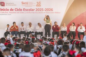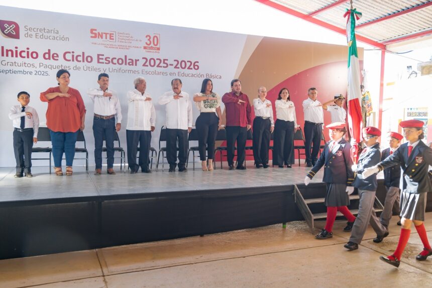 Soto la Marina, Tamaulipas.- A nombre del gobernador Américo Villarreal Anaya, el secretario de Educación, Miguel Ángel Valdez García, puso en marcha el ciclo escolar 2025–2026, en el que se entregaron más de 538 mil paquetes de útiles, 48 mil uniformes escolares y casi 4 millones de libros de texto gratuitos en el estado.