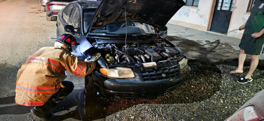 Al arribar al lugar, se localizó un automóvil Dodge Stratus que presentaba fuego en la parte frontal.