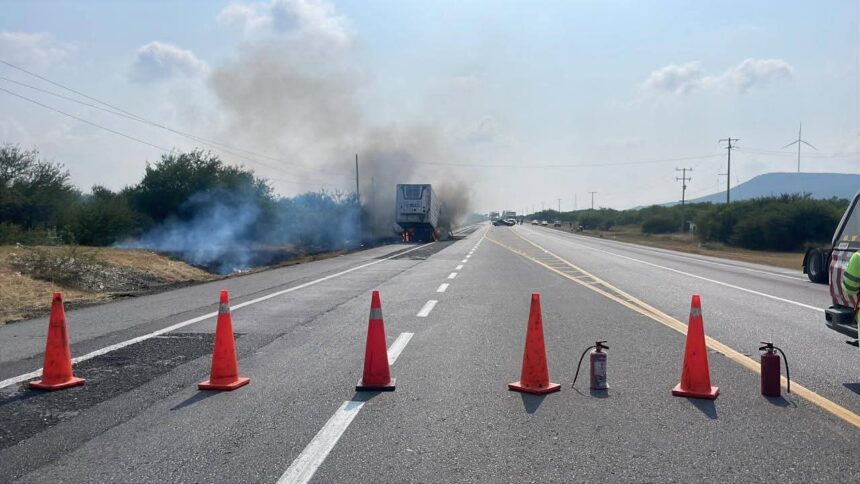LLERA.- La circulación en ambos carriles de la Carretera Federal 83 permanece cerrada en ambos sentidos, a la altura del kilómetro 18 del tramo Victoria–Zaragoza, luego de que un remolque de tractocamión se incendiara y quedara atravesado sobre la vía.