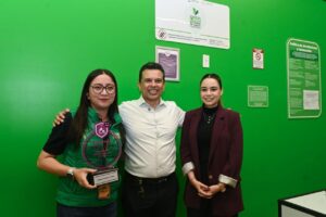 Lucy de Gattás y Eduardo Gattás, alcalde de Victoria, entregaron de manera personal la concesión de distinción a Mayra Betancourt, propietaria de la farmacéutica filial El Olivo; y la gerente general Itzel Sánchez, de Bodega Aurrera sucursal Rivera.