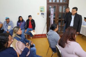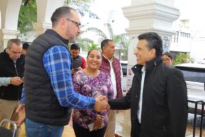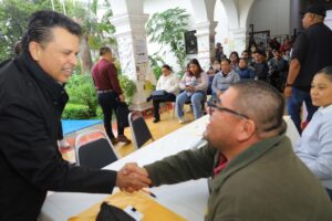 En visita a los módulos de empleo instalados en la Presidencia Municipal, dialogó con las personas que asistieron a solicitar uno de los 100 puestos laborales que bridan la maquiladora Kemet y Distribuidora de Víveres.