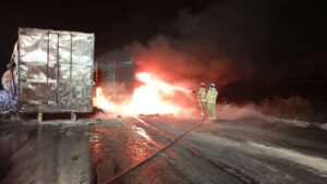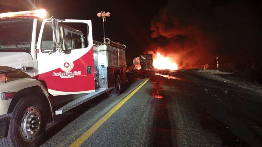 Protección Civil Tamaulipas en coordinación con los municipios de Palmillas, Tula y Jaumave, acudieron al lugar a bordo de varias motobombas debido a que tras el choque se incendiaron los tractocamiones en el