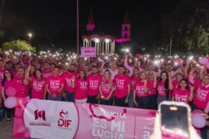 Con mensajes como “Su lucha es mi lucha”, “Detectar a tiempo es salvar tu vida”, “La prevención es amor propio”, “Un minuto de autoexploración, una vida de prevención” y “Explórate, Cuídate, Quiérete” fueron frases que acompañaron al contingente.