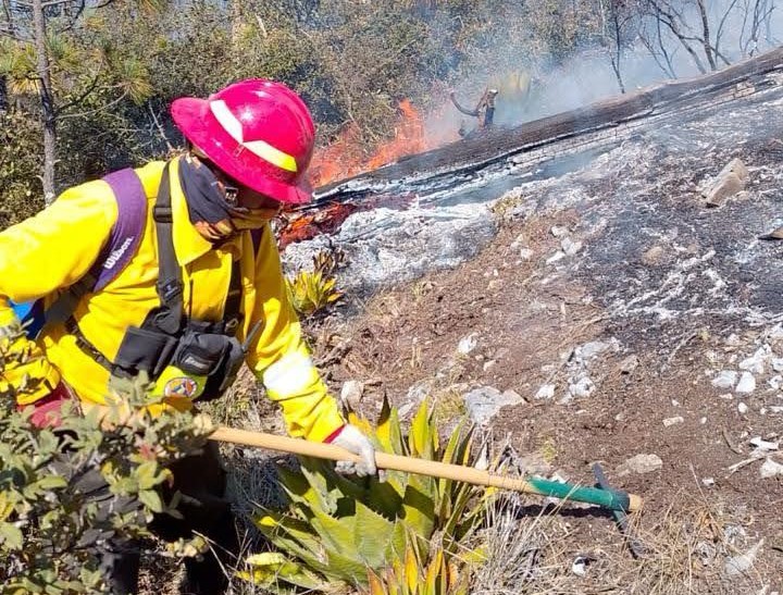 En la zona operan 112 brigadistas de distintas corporaciones, incluidos 31 combatientes de la Comisión Nacional Forestal, 16 del gobierno estatal y decenas de elementos que trabajan a marchas forzadas para contener el avance.