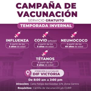 Cd. Victoria, 13 de noviembre 2025. – Con el propósito de cuidar la salud de las familias victorenses durante la temporada invernal, el Sistema DIF Victoria y su Presidenta Lucy de Gattás, invita a la población a participar en su Campaña de Vacunación Gratuita, disponible en el área de Atención a la Salud.