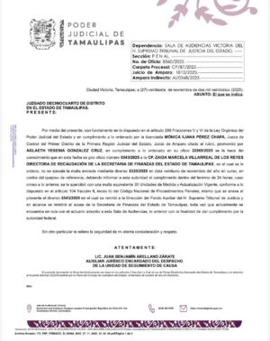 En cumplimiento con lo ordenado en el Juicio de Amparo 22869/2025, se giró el oficio 8543/2025 a la Secretaría de Finanzas del Estado de Tamaulipas para que no se ejecute la sanción.
