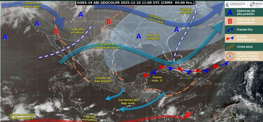 Por otra parte, señaló el SMN de la Conagua, un canal de baja presión en el oriente y sureste del territorio nacional, la corriente en chorro subtropical, una vaguada en altura y el ingreso de humedad del Océano Pacífico, Golfo de México y Mar Caribe generarán lluvias y chubascos en las regiones del norte, noreste, occidente, oriente, centro, sur y sureste del país, incluida la Península de Yucatán.