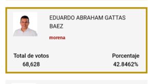 Los resultados oficiales dan a Gattás Báez 68 mil 628 votos.