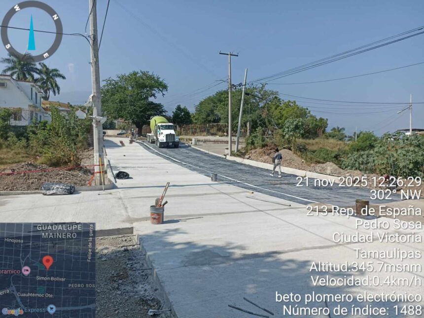 En la colonia Pedro Sosa de Cd. Victoria registran gran avance los trabajos de pavimentación de calles adyacentes al Santuario de la Virgen de Guadalupe, así como de la calle Simón Bolívar, por parte de la Secretaria estatal de Obras Públicas a cargo del Ing. Pedro Cepeda Anaya.