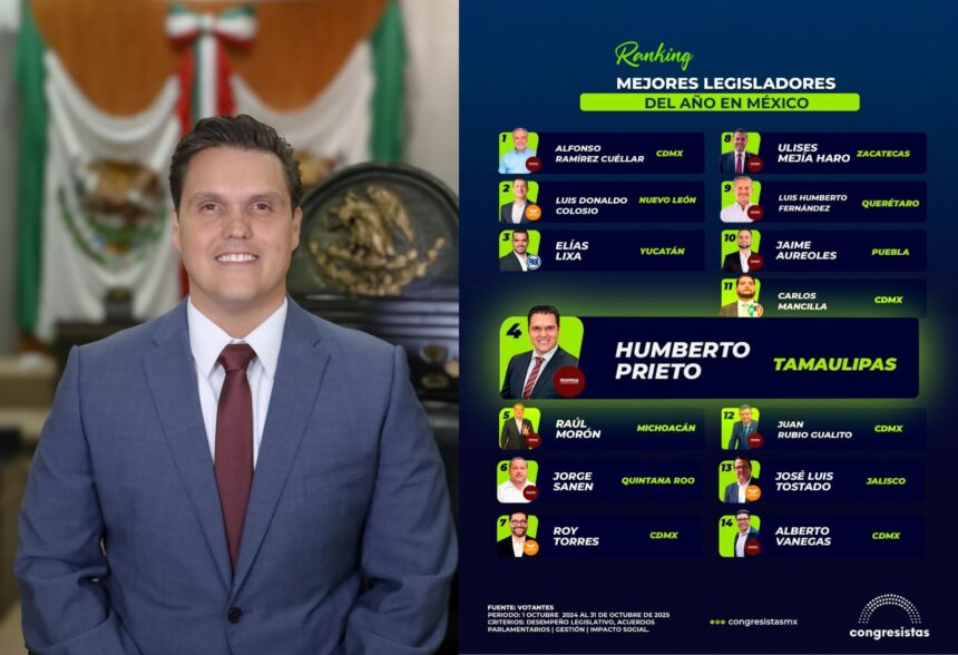DE acuerdo “al Ranking 2025 del Portal congresistasmx”, el Diputado presidente de la Junta de Gobierno del Congreso de Tamaulipas Humberto Armando Prieto Herrera, resultó calificado “en el Top 5” de los mejores legisladores mexicanos, “gracias a su acertado trabajo legislativo” que, ha instrumentado en bien de las y los tamaulipecos, “perfilándose por ello, hacia un gran futuro político y social de gran envergadura”.