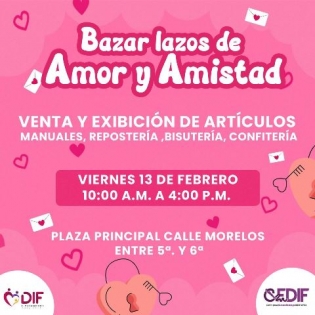 Matamoros, Tam.- En el marco de las celebraciones por el Día del Amor y la Amistad, el Sistema DIF Matamoros invita a la ciudadanía a asistir al “Bazar Lazos de Amor y Amistad”, un evento que busca resaltar el trabajo artesanal y el talento de quienes integran los centros de capacitación del organismo.