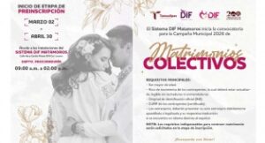 Matamoros, Tam.- El Sistema DIF Matamoros que encabeza la Lic. Ana Ariceaga de Granados en coordinación con el Sistema DIF Estatal, abren la convocatoria dirigida a todas las parejas interesadas en contraer nupcias y formar parte de la Campaña Municipal de “Matrimonios Colectivos 2026”.