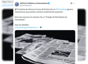 CDMX.- La organización ARTICLE 19 México y Centroamérica manifestó su preocupación ante una iniciativa de reforma a la Ley para la Protección de Personas Defensoras de Derechos Humanos y Periodistas en Tamaulipas, al advertir que podría abrir la puerta a mecanismos de control estatal sobre el ejercicio periodístico bajo criterios éticos.