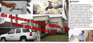 “TRAS LA emisión de un infantil e irrisorio comunicado de prensa” del Ayuntamiento de Reynosa, “quedaron confirmadas las imperdonables mentiras de la ex alcaldesa Maki Ortiz y su hijo Carlos Peña, el Makito”, al asegurar éste de manera ignorante e irresponsable que, “con 5 millones de pesos resolverían” el problema de la falta de agua que, sufren las familias de Reynosa.