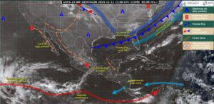 Por otra parte, canales de baja presión sobre el centro y sureste del país, en combinación con el ingreso de humedad del Océano Pacífico y Golfo de México e inestabilidad atmosférica, ocasionarán lluvias y chubascos en estados del occidente, centro, oriente, sur y sureste del territorio nacional, incluida la Península de Yucatán, con lluvias puntuales fuertes en Michoacán (centro), Chiapas (este), Tabasco (centro y este), Campeche (este) y Quintana Roo (centro y sur).