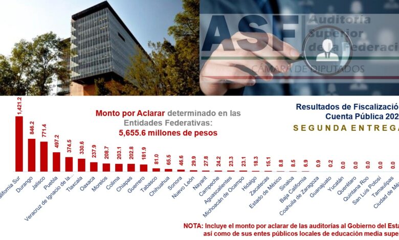 Mientras que Tamaulipas, junto a la Ciudad de México, Querétaro, San Luis Potosí, Quintana Roo y Yucatán, no tuvieron montos observados, de la revisión a entidades federativas, se determinó un monto por aclarar por más de cinco mil 655 millones de pesos distribuidos entre los estados que resultaron con un posible daño patrimonial. Por su parte, las entidades con más observaciones, digamos las peores calificadas fueron Baja California Sur, Durango, Jalisco, Puebla, Veracruz, Tlaxcala y Oaxaca.