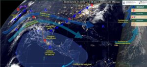 Interaccionará con un canal de baja presión que se extenderá sobre el sureste mexicano y originará lluvias e intervalos de chubascos en dichas regiones.